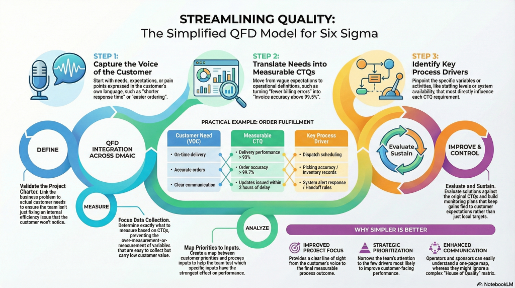 Within a standard Six Sigma environment, a simplified QFD model can provide much of the value of traditional QFD without the complexity that often slows teams down. Used properly, it becomes a practical bridge between customer expectations, process improvement, and measurable project goals.